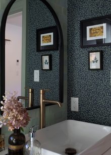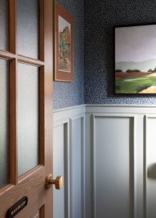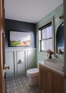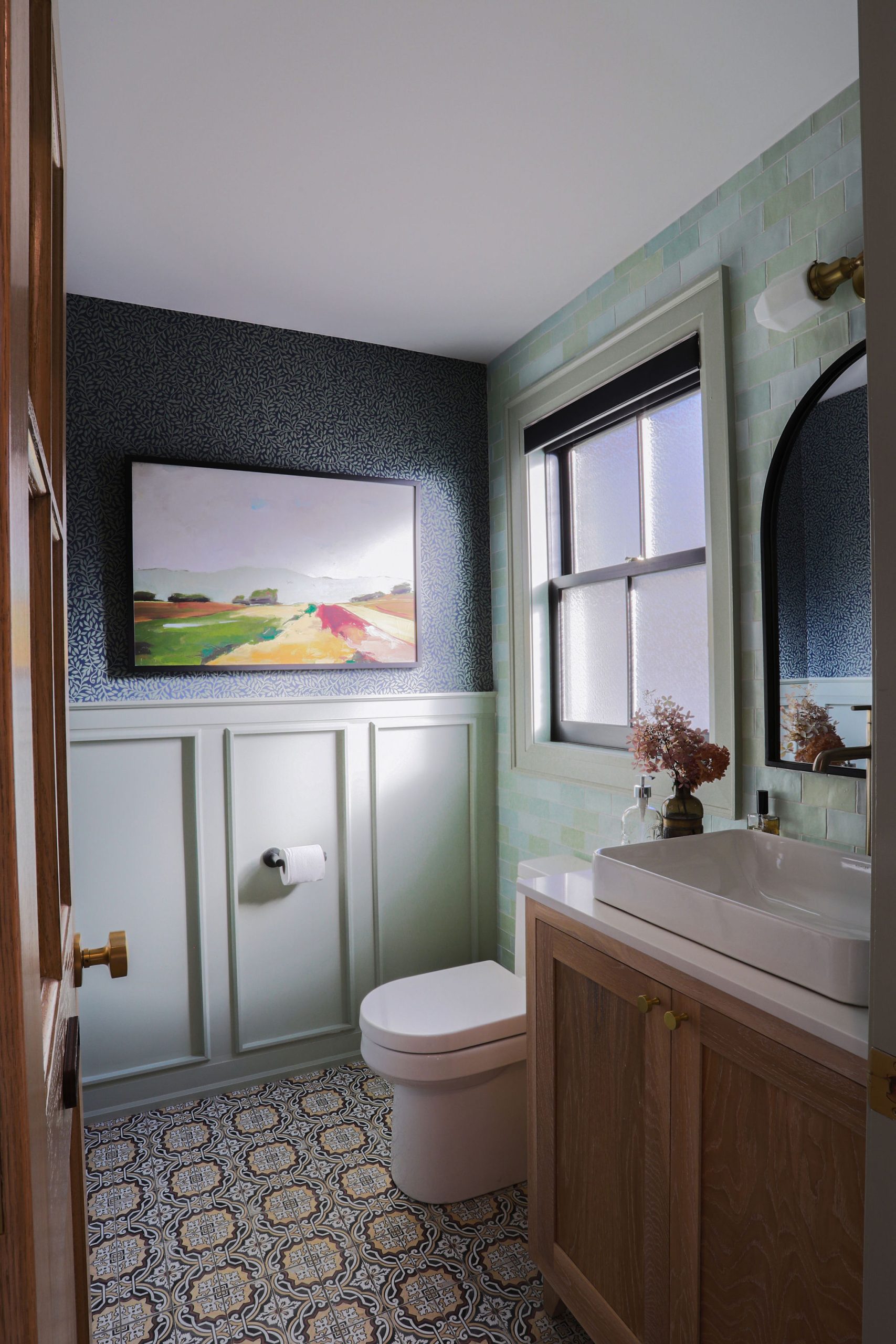 A matte mint fireclay tile lines one entire wall and was purchased locally by Hamilton’s Tile. This specific tile looks old-world in a modern way, flaunting green and cream hues that give the room its pop. Custom wainscotting on opposite walls compliment in colour and show dimension in a muted manner with a traditional profile and deep multi-point bevel edging. The wainscotting paint color is Saybrook Sage by Benjamin Moore. The wood windows here are made by Marvin purchased locally from Ultimate Windows & Doors and have black wood both on the inside and out.