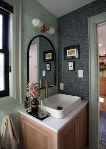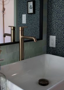 Adding warmth is the Emtek vanity hardware, doorknob and Schoolhouse Electric wall sconce. A custom made white oak bathroom vanity is anchored by furniture legs with a quartz countertop from Select Kitchens. A vessel sink is placed on top with a matte brass Kohler trough-style tap. A bold pattern floor tile smoothes out any visuals between the cool tones with its deep rust hues. Also tying into the 1850 era of the heritage building with an ornate flair. As the building was a former gardeners’ cottage on the Robertson Estate in Rothesay, New Brunswick.