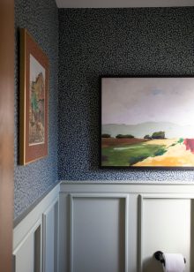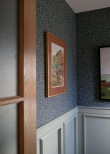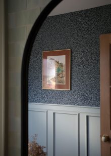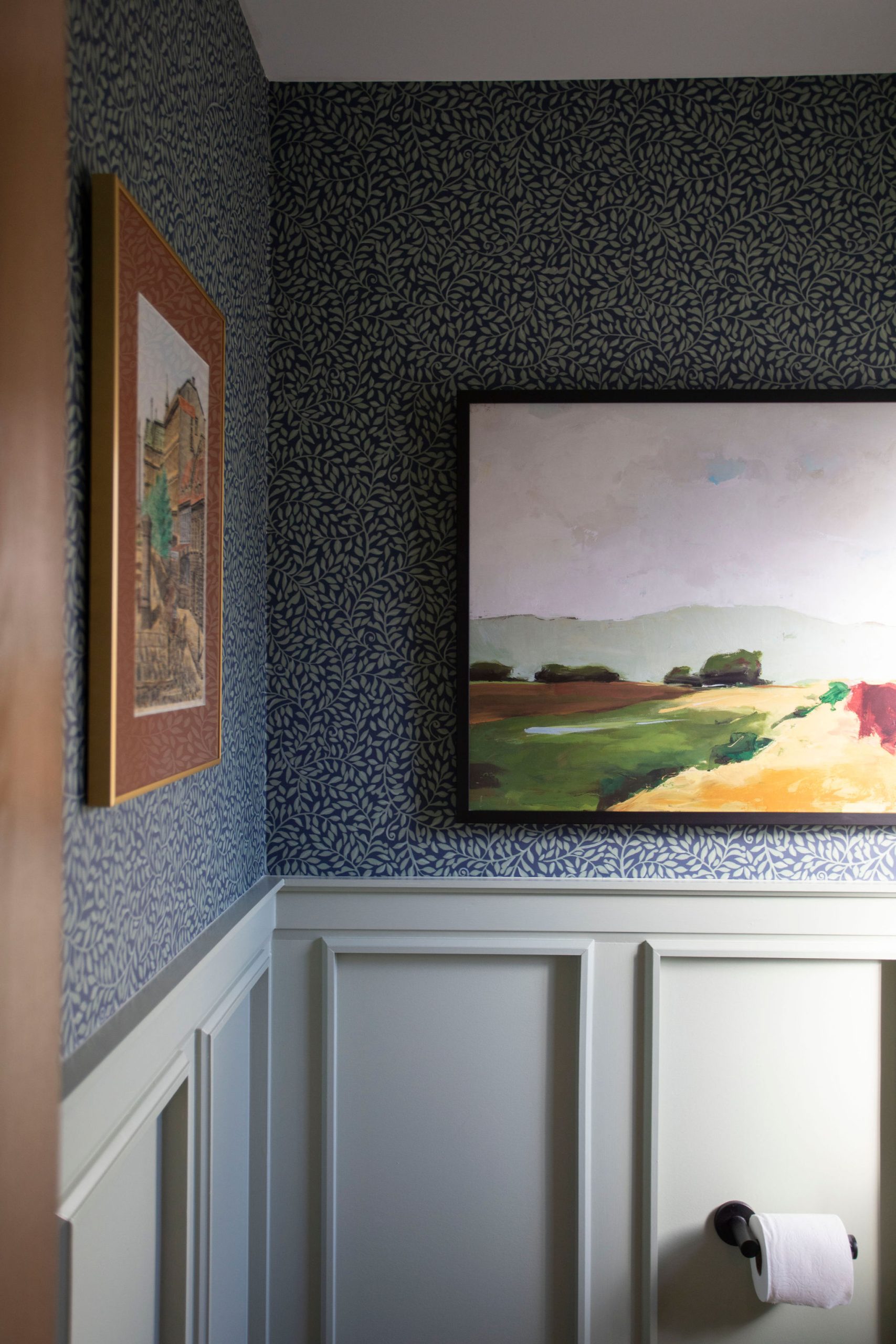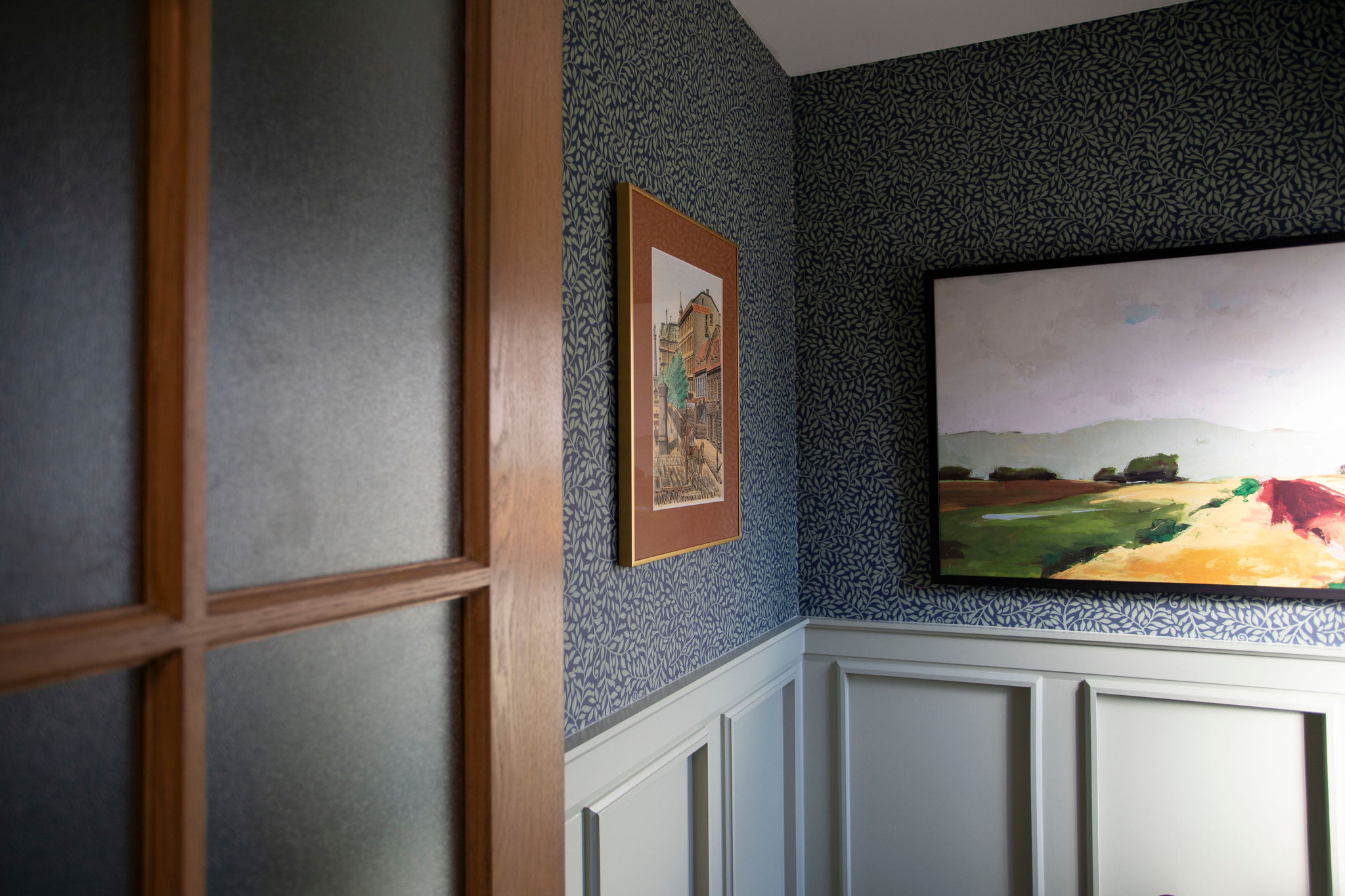 In small spaces, everything must count making this a professional yet personal part of our office. It seemed fitting adding pieces of art. Each chosen to equip the uniqueness and friendliness of its area wether it be thrifted or new, and all locally framed by Framing Factory. Lastly, the Sandberg wallpaper acts as the backdrop that pulls everything together. Its layered foliage adding texture, movement, and a quiet charm to the space.