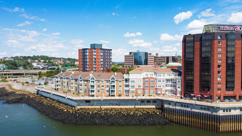 The feeling of contemporary craftsmanship embraces you at this condo overlooking the Bay of Fundy and our industrious port where the scene changes with the tides. The wall of windows in the living room line the blue ocean view in addition to framing cruise ships turning nearby to get docked on triple ship days at Long Wharf.
